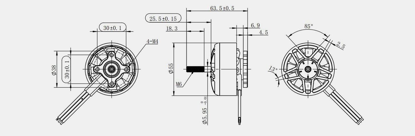 | Max. P (W) | Napätie (V) | Max. ja (A) | KV | Prúd naprázdno (A) | Odpor (mΩ) | Poliaci | Rozmer motora (mm) | Stator Dim. (mm) | Montáž (mm) | N.W. (g) | Prop. (palec) | ||||||||||||||